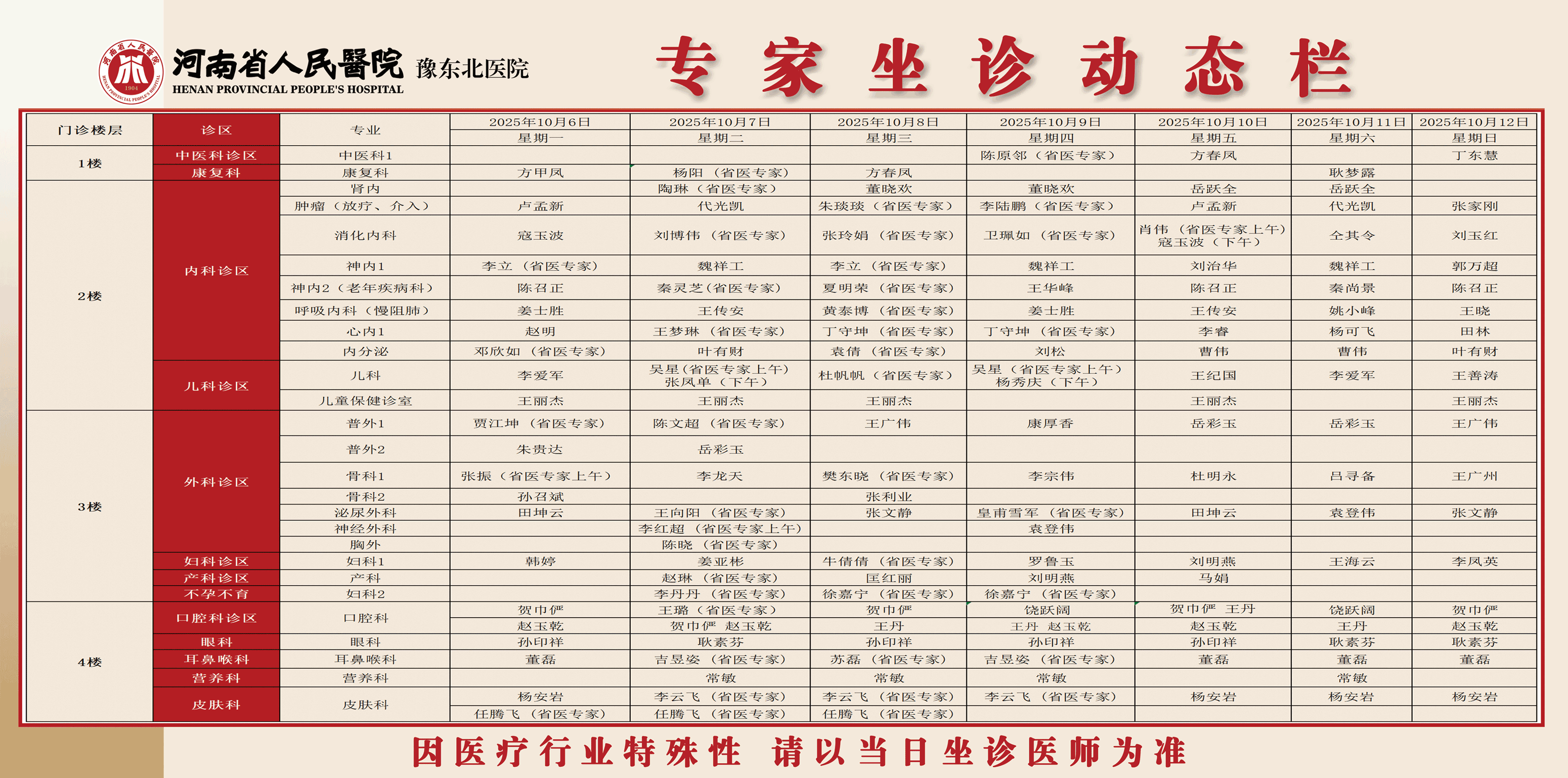 豫东北医院10月6日-10.12专家坐诊表,一键查询