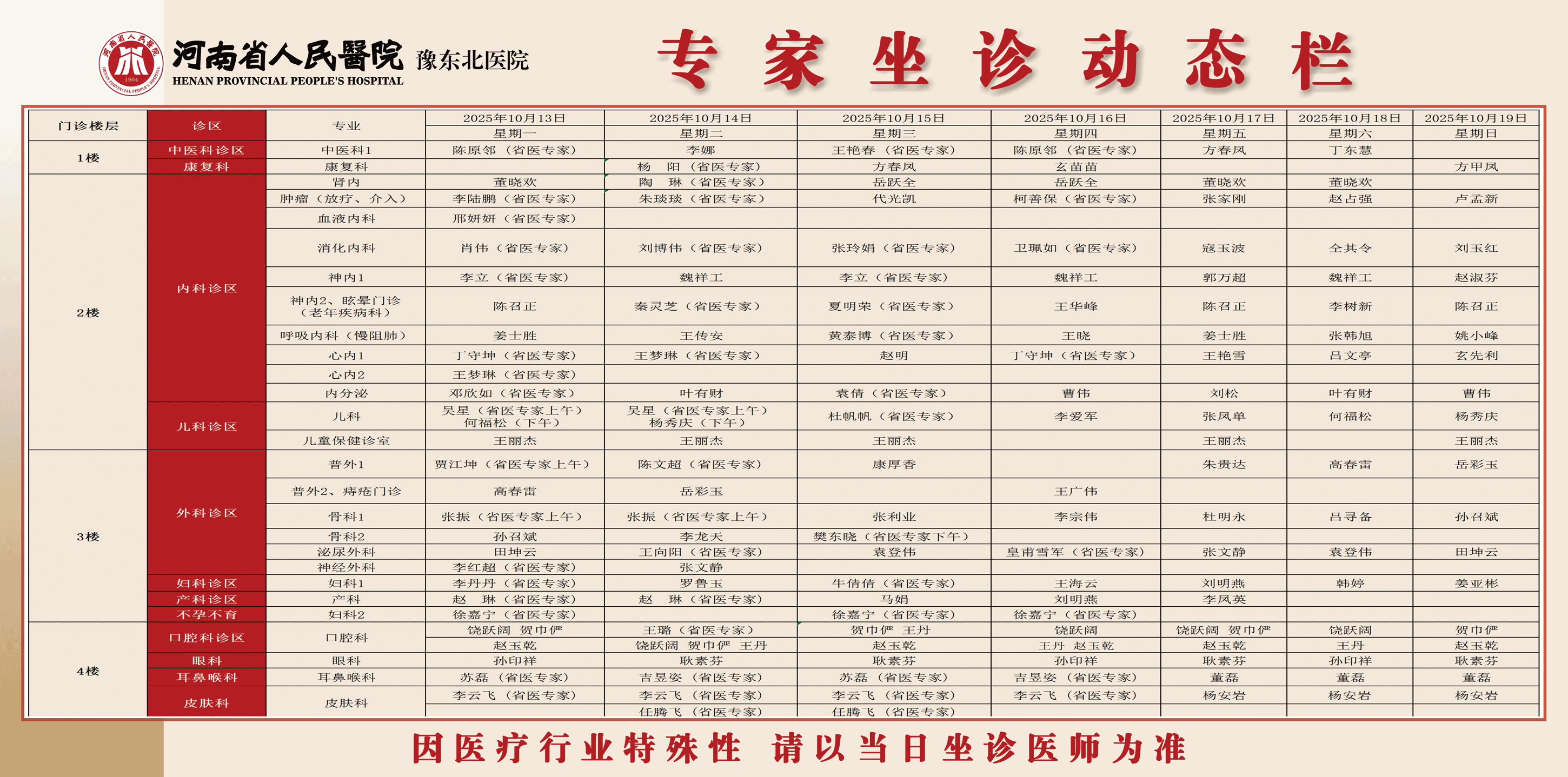 豫东北医院10月13日-10.19专家坐诊表,一键查询