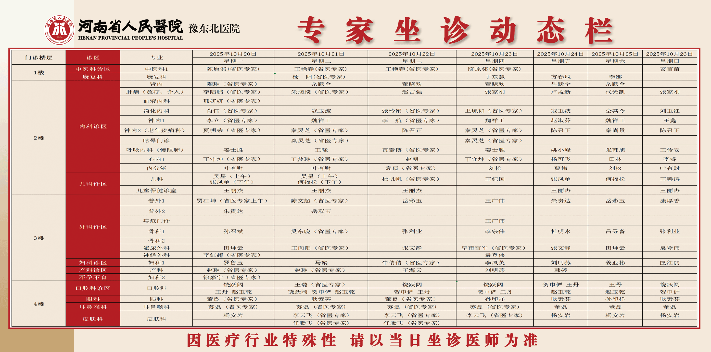 豫东北医院10月20日-10.26专家坐诊表,一键查询