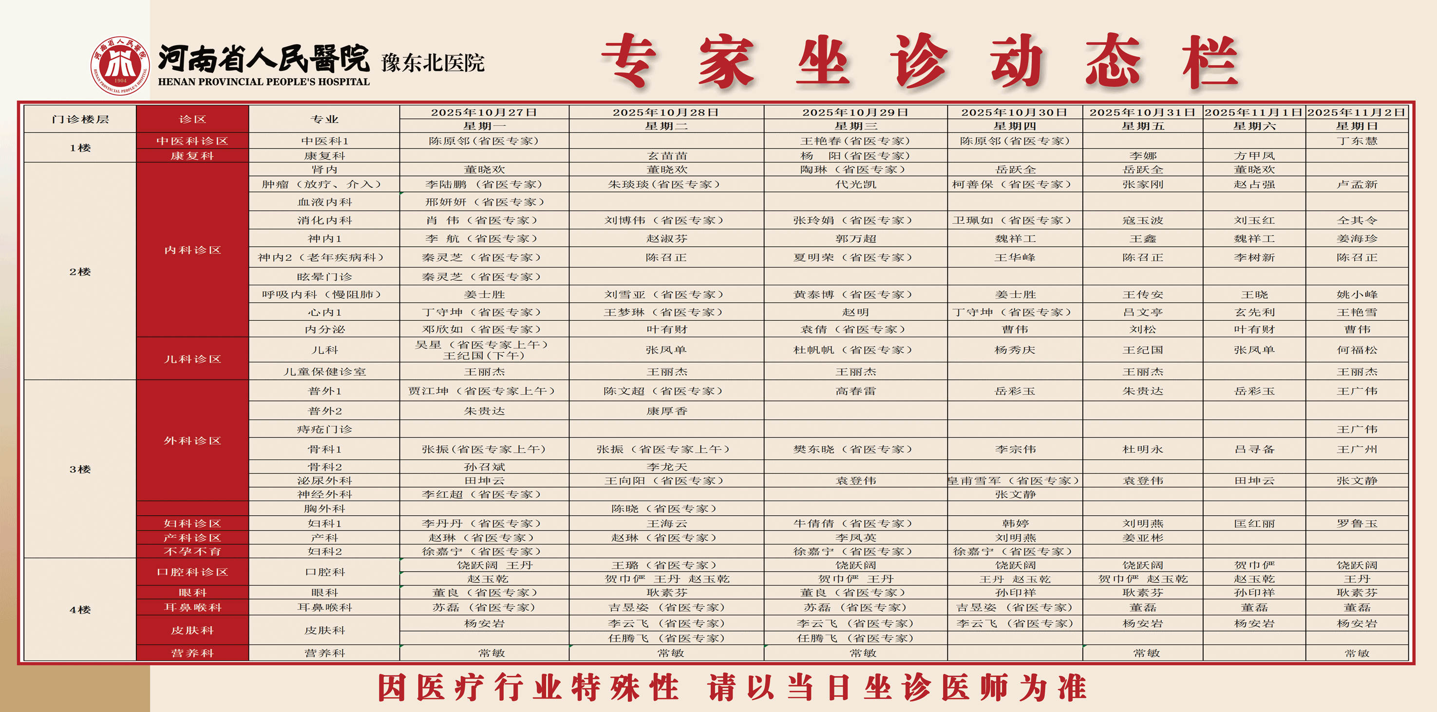 豫东北医院10月27日-11月2日专家坐诊表,一键查询
