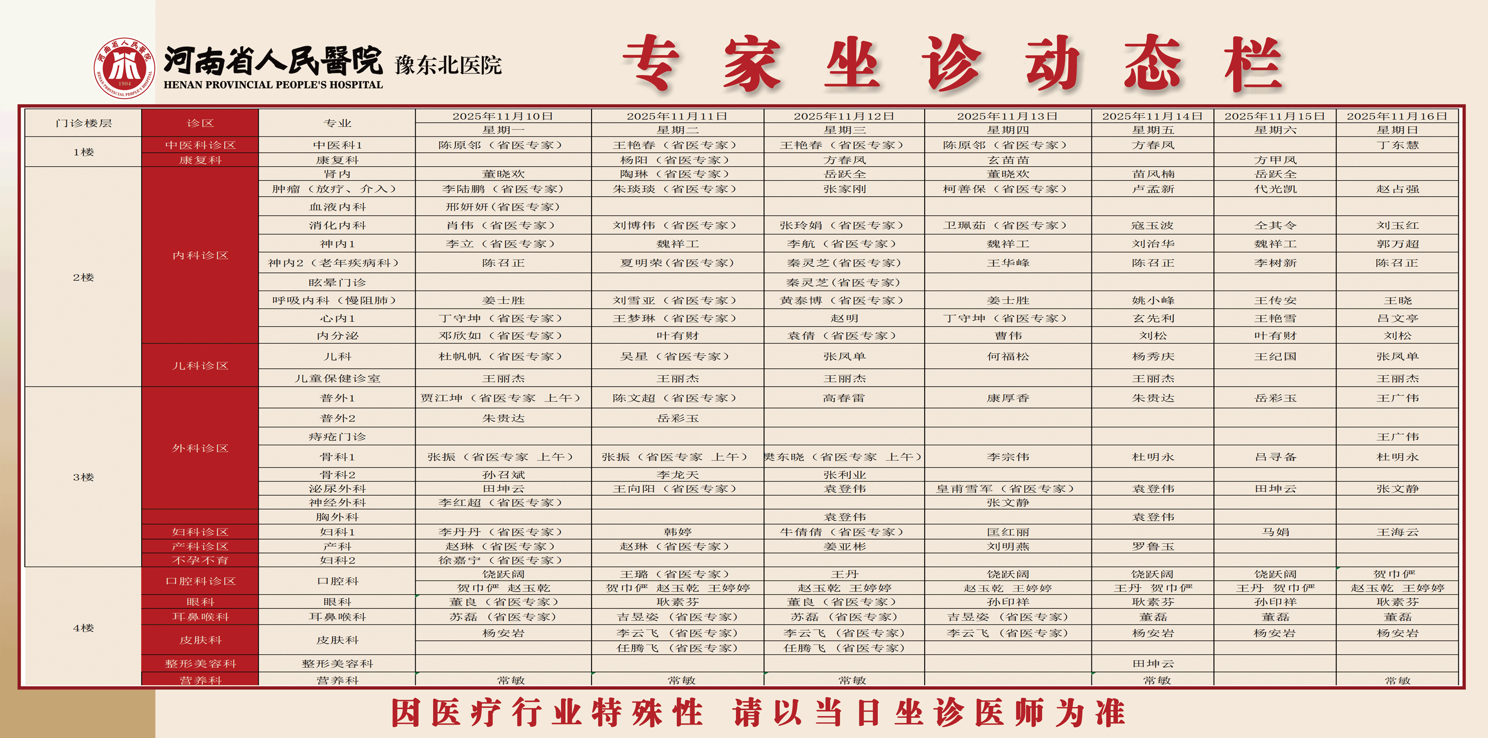 豫东北医院11月10日-11月16日专家坐诊表,一键查询