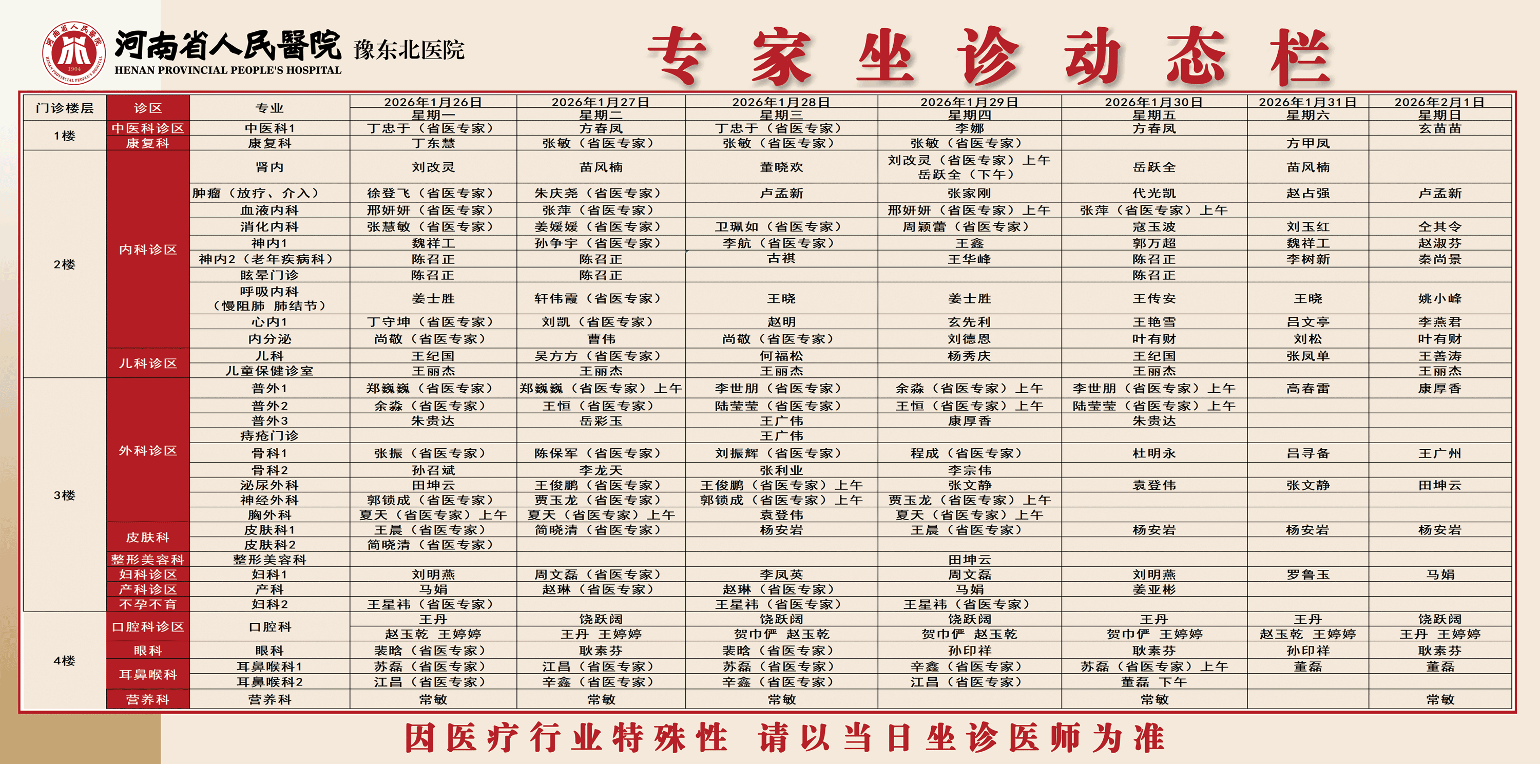 豫东北医院1月26日-2月1日专家坐诊表,一键查询